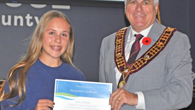 Josie Girodat, a member of the Walkerton Figure Skating Club, is presented with a certificate of recognition by Brockton Mayor Chris Peabody.