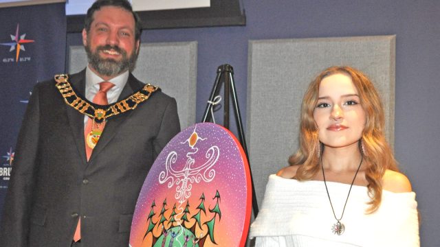 WALKERTON - A young artist, 17-year-old Kennedy Cameron-Nashkewa of Saugeen First Nation, attended the Sept. 18 meeting of Bruce County Council to unveil her new work, Aki Ogichidaa, commissioned by the county to commemorate the formal introduction of the Bruce County land acknowledgement.