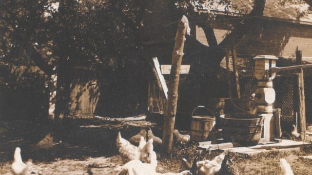 In this image from the collections at Stratford-Perth Archives, you can see a little girl feeding her chickens. Emma and Will Soeder of 216 Huron Street in Stratford sent this photo postcard of their daughter to their cousins to wish them a Happy New Year in the early 1900s. There were many chicken