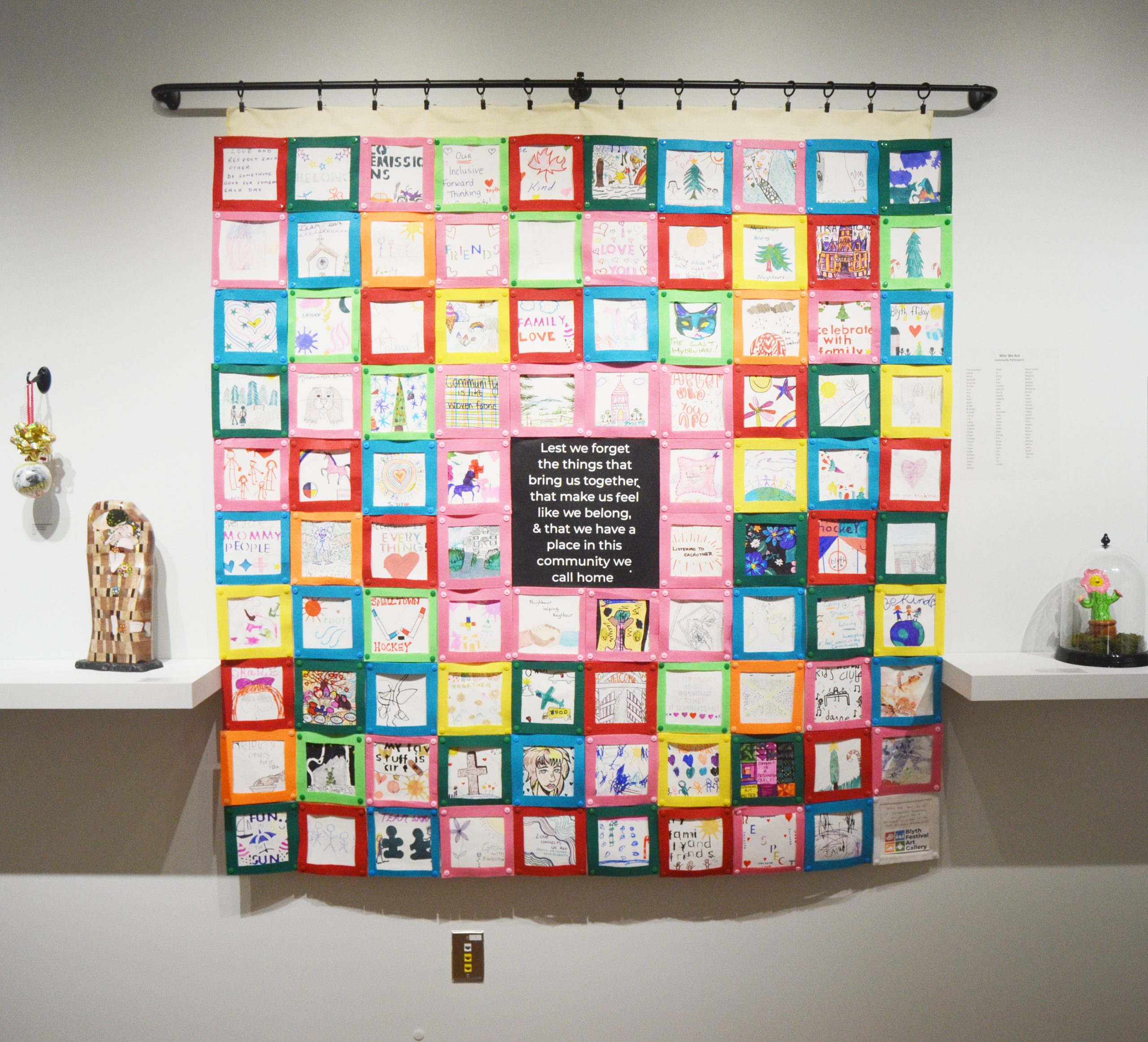 A big part of the Blyth Community Art Show at the Blyth Festival Art Gallery is the Who We Are piece. The collaborative effort saw community members draw their own patches for a quilt-work creation. The patches were to represent “the things that bring us together, that make us feel like we belong, and that we have a place in this community we call home.”