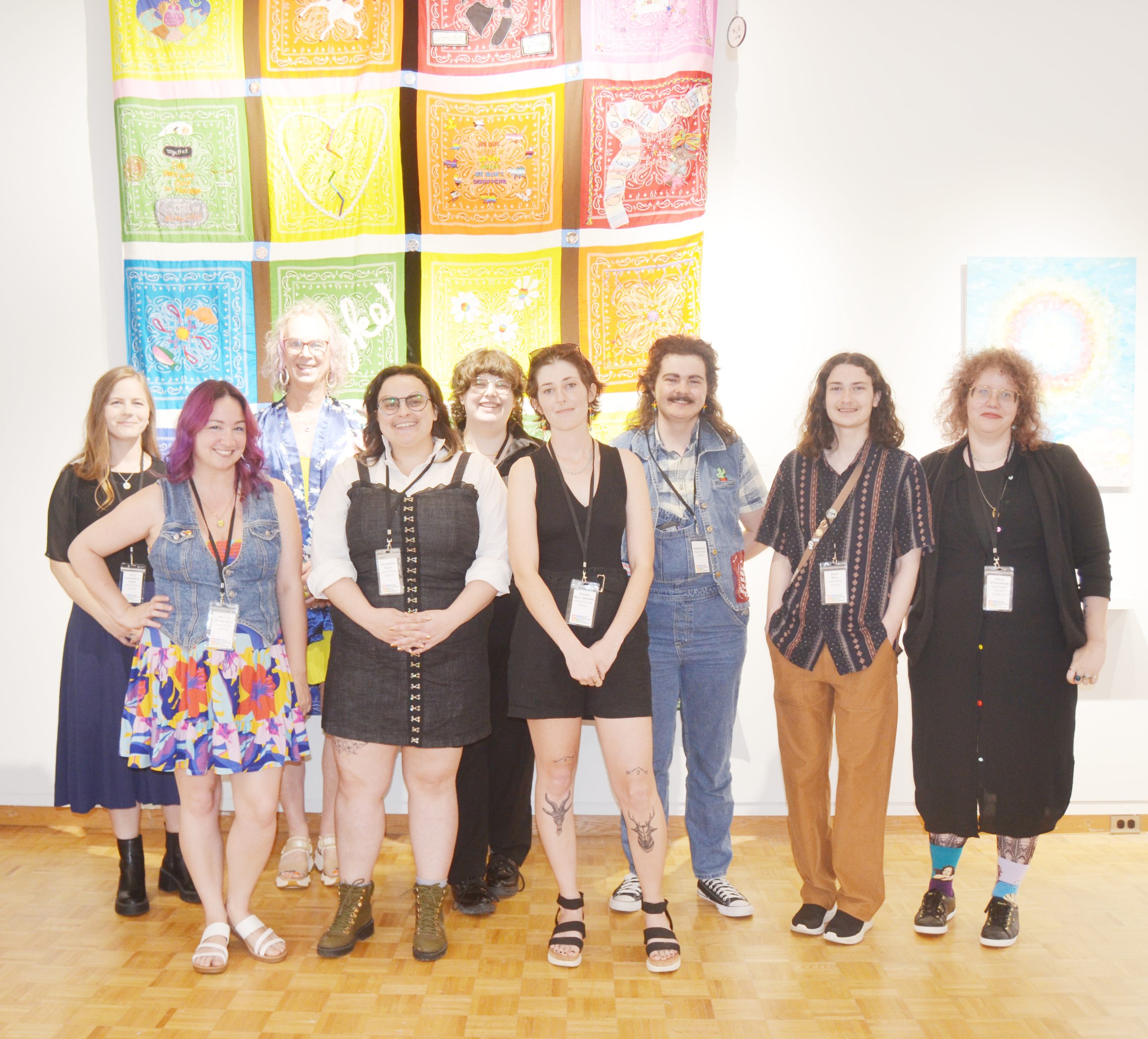From left: artists that submitted work for the Blyth Festival Art Gallery’s The Rural Queer Agenda show stand in front of a quilt coordinate by Mabe Kyle that focused on the experience of queer life. From left: Ally Campbell-Main (she/her), Nicole Campbell (she/her), Gillian VandenHeuvel (she/her), Nathanya Field (she/they)(front), Frankie Field (they/them), Faven Bell-Jerome (they/them), Mabe Kyle (they/them/theirs), Alec Will (he/him) and Kelly Stevenson (she/her). (Denny Scott photo)