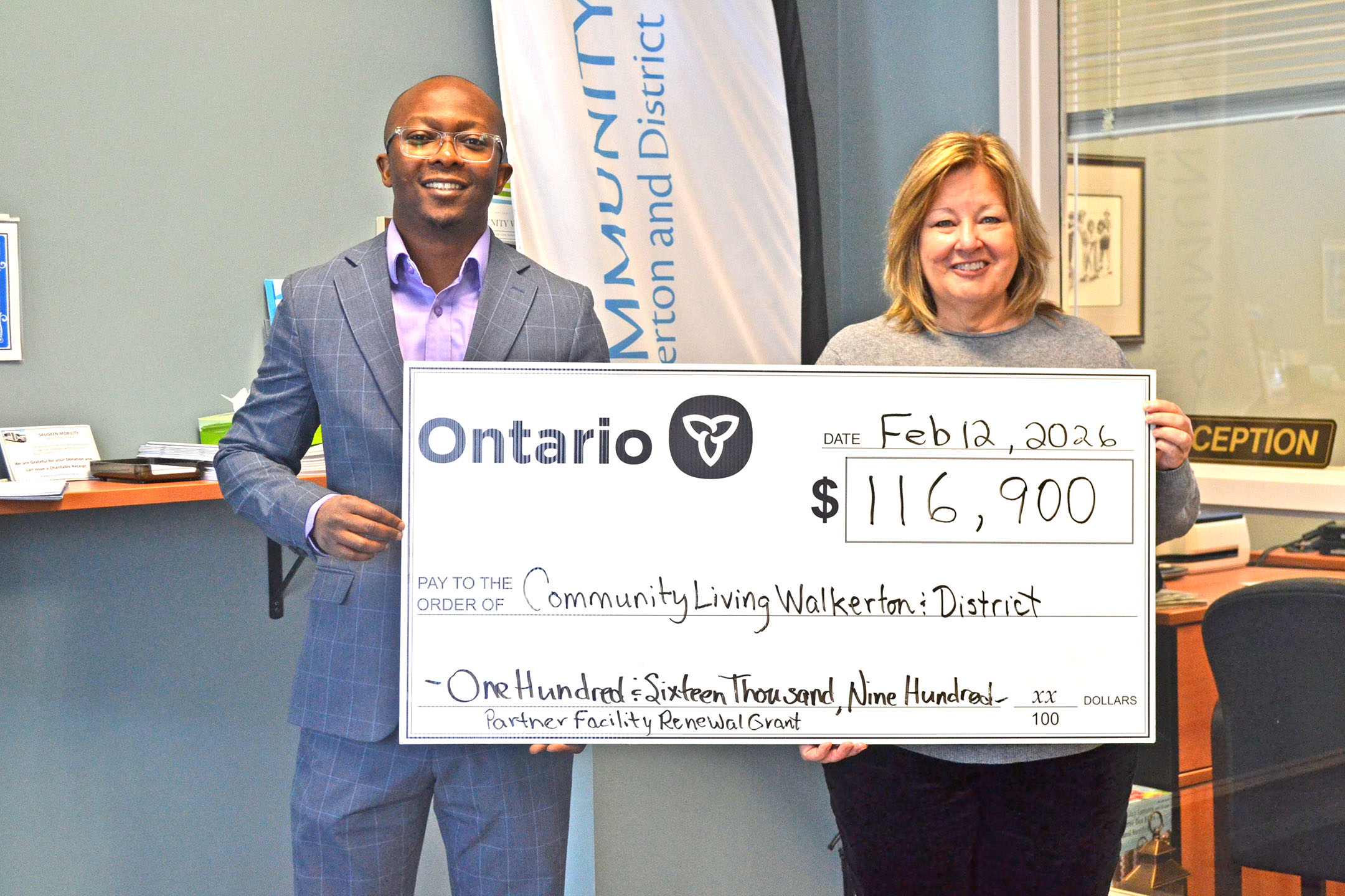 Huron-Bruce MPP Lisa Thompson presents Community Living Walkerton and District CEO Jeffrey Adisam (left) with $116,900 provided through the Partner Facility Renewal Grant to complete infrastructure improvements that enhance safety, accessibility and reliability for residents. Funding will support the replacement of the roof and eavestrough, replacing flooring in a bathroom and bedroom, replacing the flooring in the main entrance and bedrooms, installation of commercial flooring in the kitchen and dining room, installation of two generators, installation of an accessibility ramp, replacing the floor on the main level, installation of a furnace and air purification system, and repairing of foundation leaks. (Emily Bowen photo)