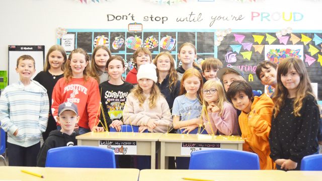 Ms. Earl’s Grade 4/5 Class at Maitland River Elementary School, shown smiling and posing with their bridges, have been learning about earthquakes through the contraptions shown