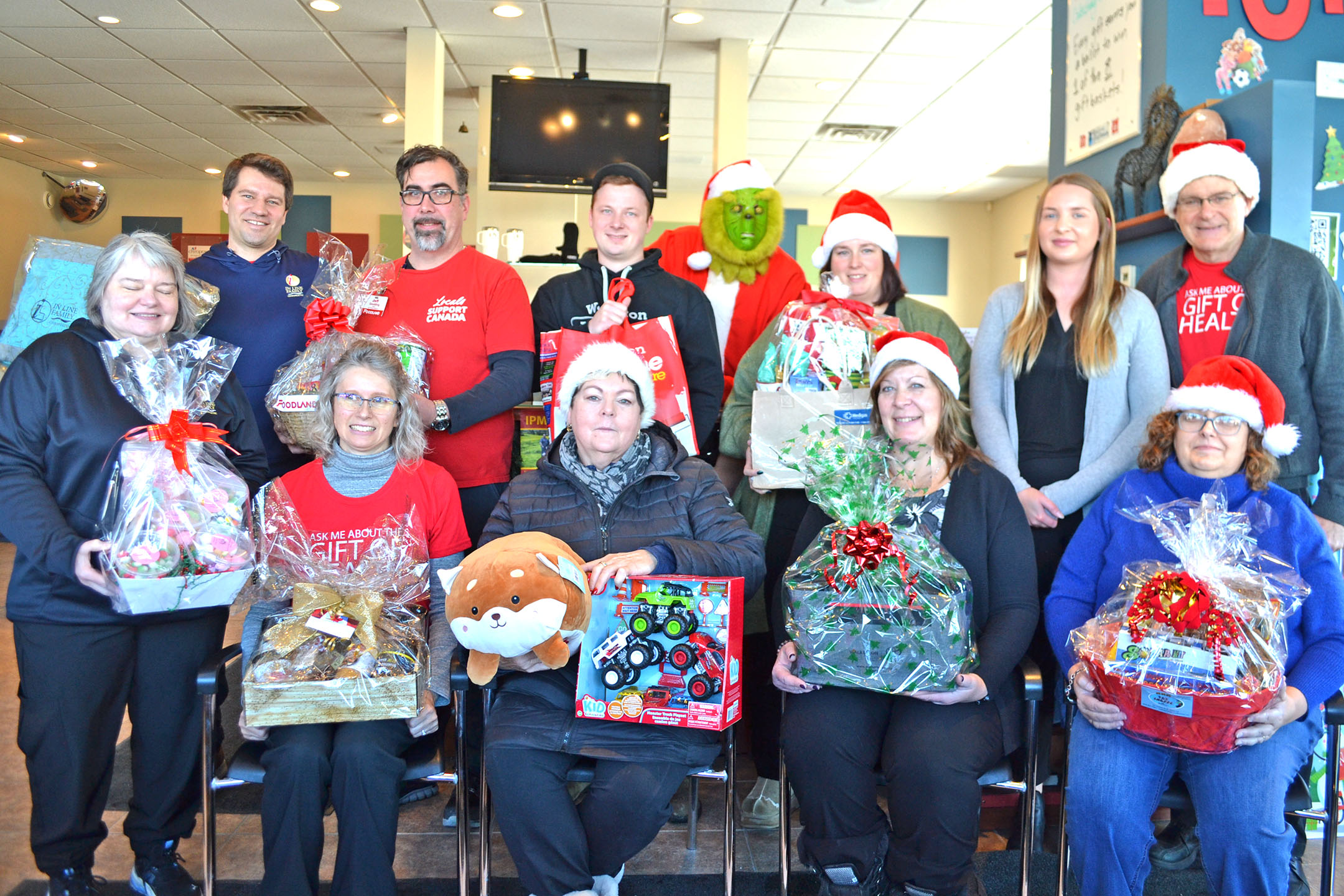 Gift baskets were donated by local businesses to support Toys for Tots collection efforts. Back, from left: Dr. Adam Alexander, Jeff Goulding, Joel Pletch, The Grinch (Paul Kuntz), Stephanie Doerr, Lauren Ritchie, Dr. Glenn Lang. Front, from left: Katherine Butchart, Joanne Verstege, Betty-Anne Elliott, Marijo Lamont, and Dawn Eggleton. (Emily Bowen photo)