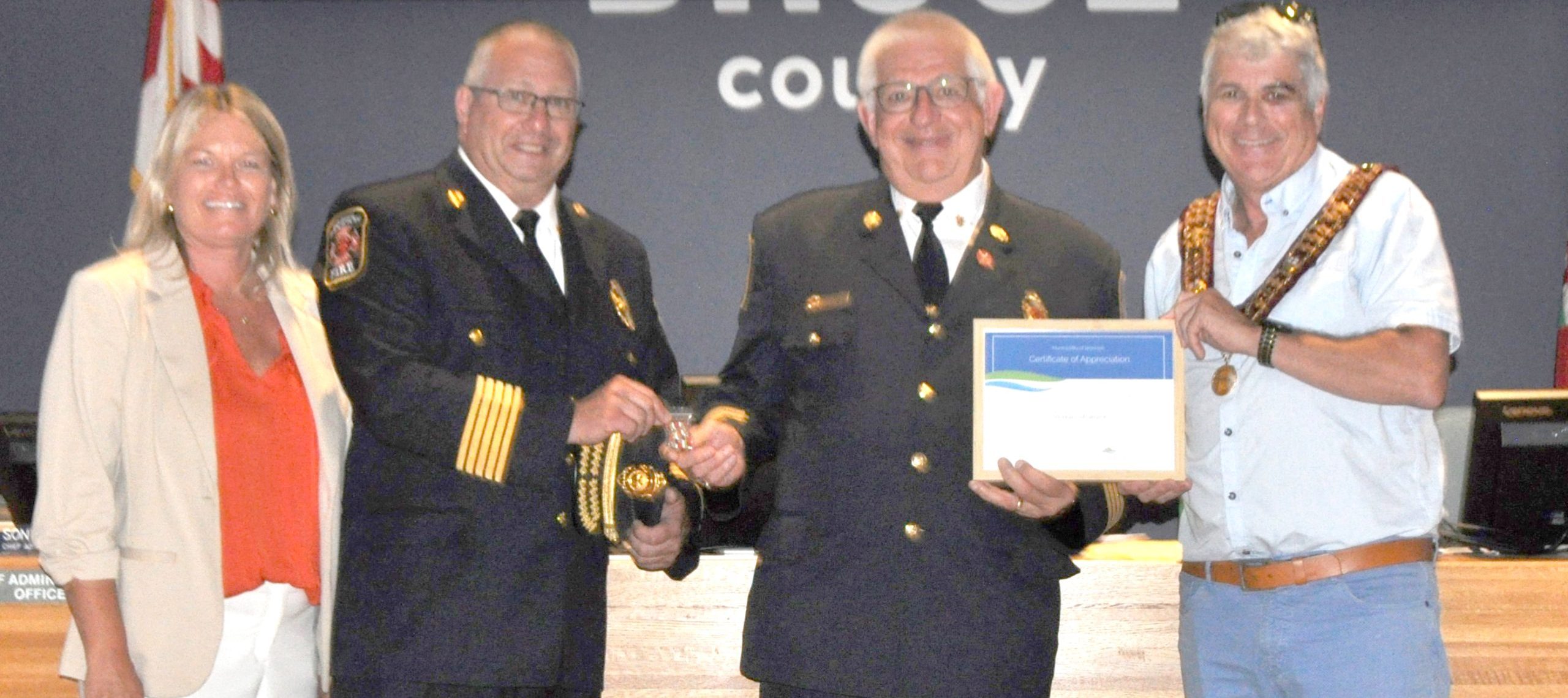 Walkerton Deputy Fire Chief Glen Wilhelm is presented with a medal and certificate of appreciation commending him for a remarkable 50 years of service with the department. That service continues. The presentation took place during the July 15 meeting of Brockton Council. From the left are CAO Sonya Watson, Fire Chief Chris Wells, Wilhelm and Mayor Chris Peabody. (Pauline Kerr photo)