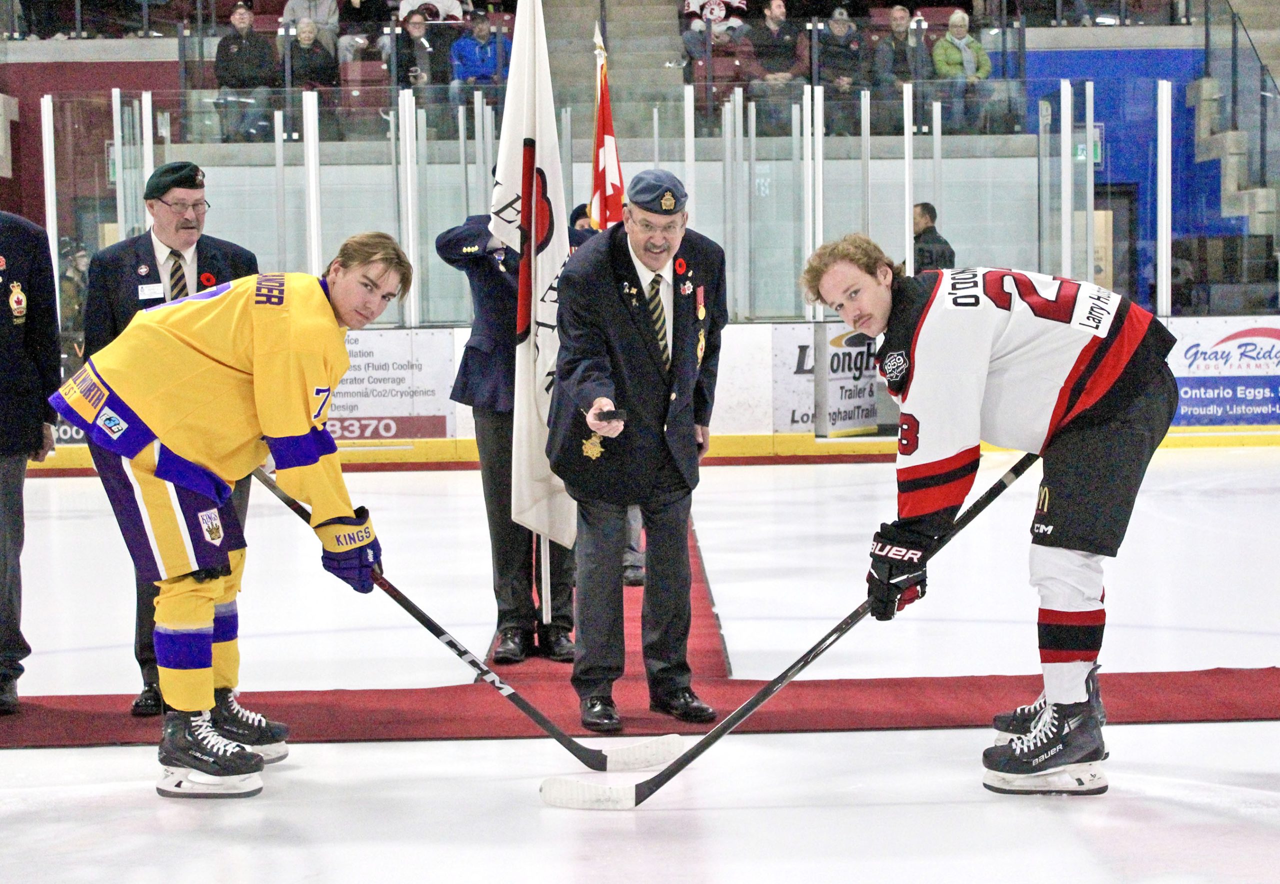 The Listowel Cyclones held their Veteran Appreciation Night on Friday, Nov. 7, which included a ceremonial puck drop ahead of Remembrance Day. From left: Komoka Kings player Riley Alexander, Brian Kaye and Cyclones player Jack O’Donnell. (Nicole Beswitherick photo)
