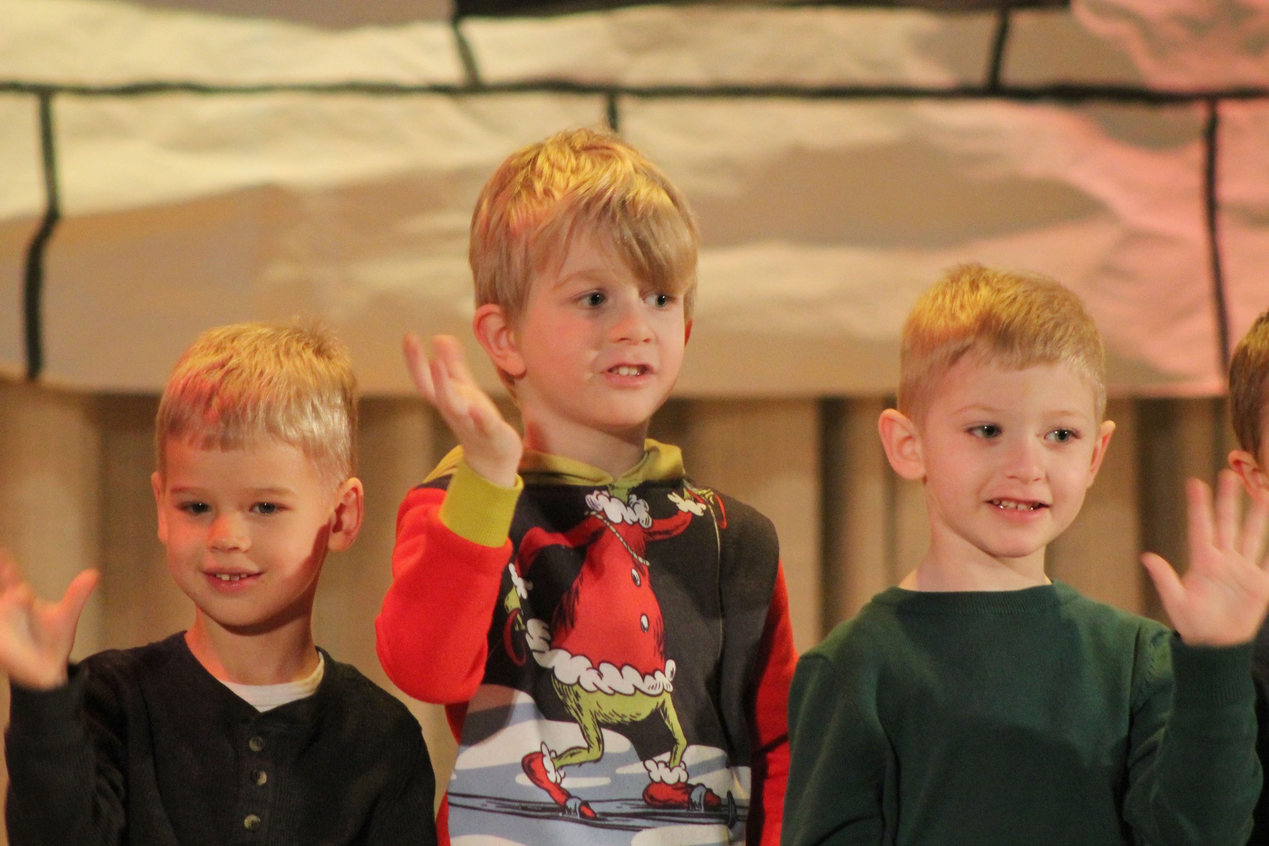 - Jace Coleman, Lucas Bent, Priam Kllokoqi wave to the crowd at the Eastdale Public School Kindergarten Christmas Concert. (Kelsey Bent photo)