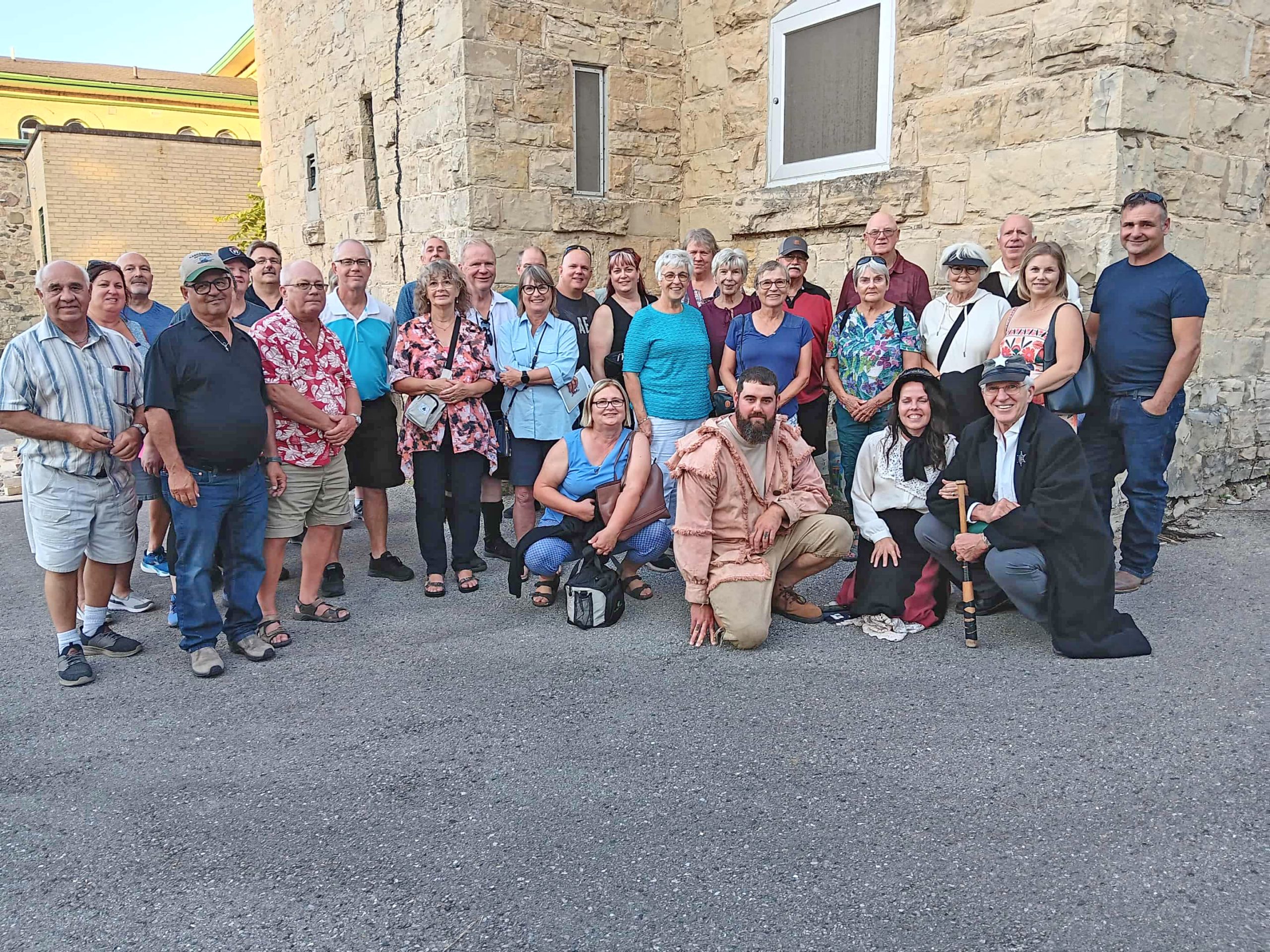 Costumed characters and attendees pose for photo in front of stone building.