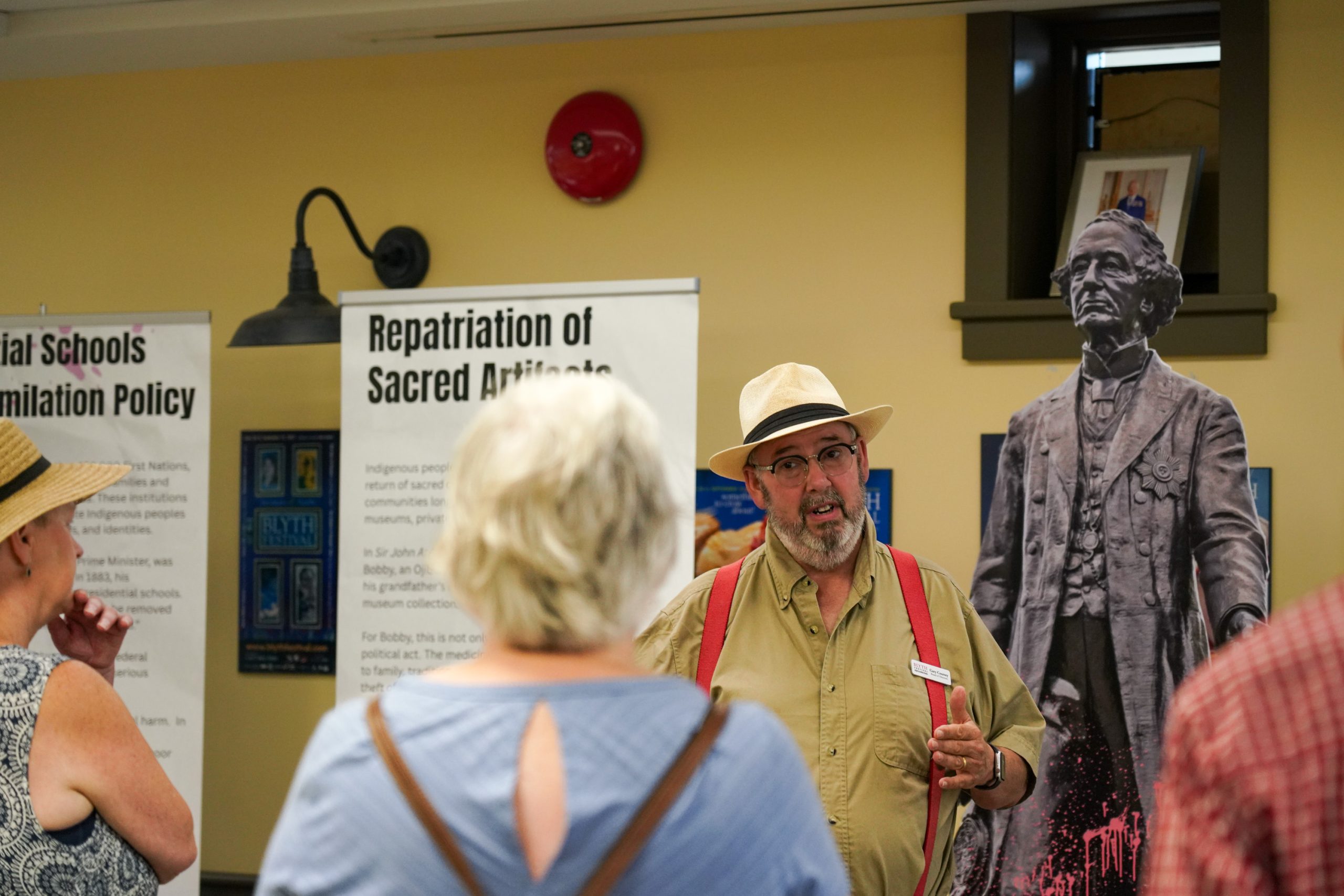 Gary Coursey tells his guests about the history of Memorial Hall before the guided walking tour of Blyth heads out into the heat of the day. The small and intimate event was attended by locals and visitors from out of town who heard about the tour during a recent visit to the theatre for a show. (Cory Bilyea photo)