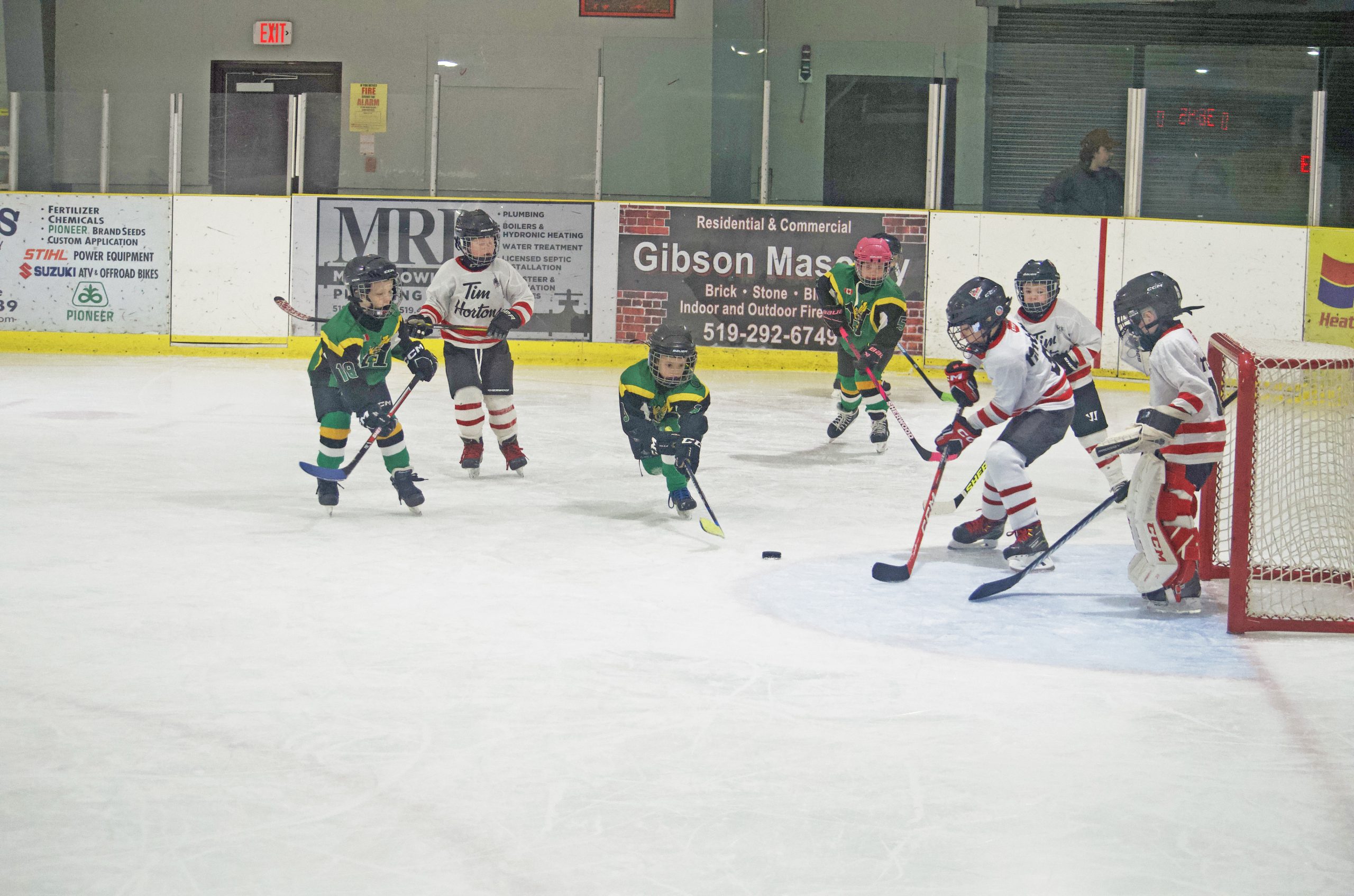 Youngsters on both teams skate for the puck.