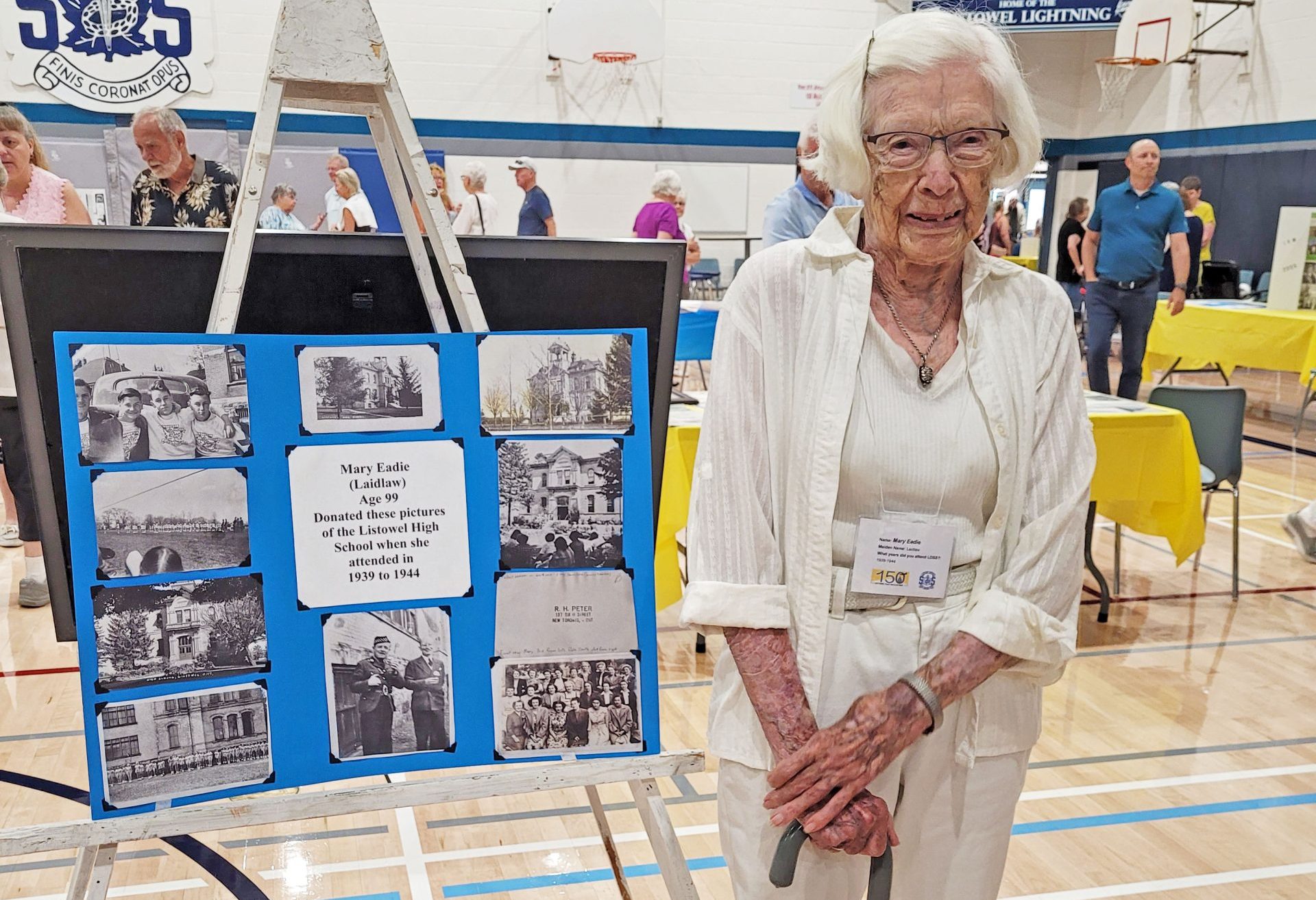 Mary Eadie stands beside photographs of her high school years at LDSS, at LDSS's gym during the reunion.
