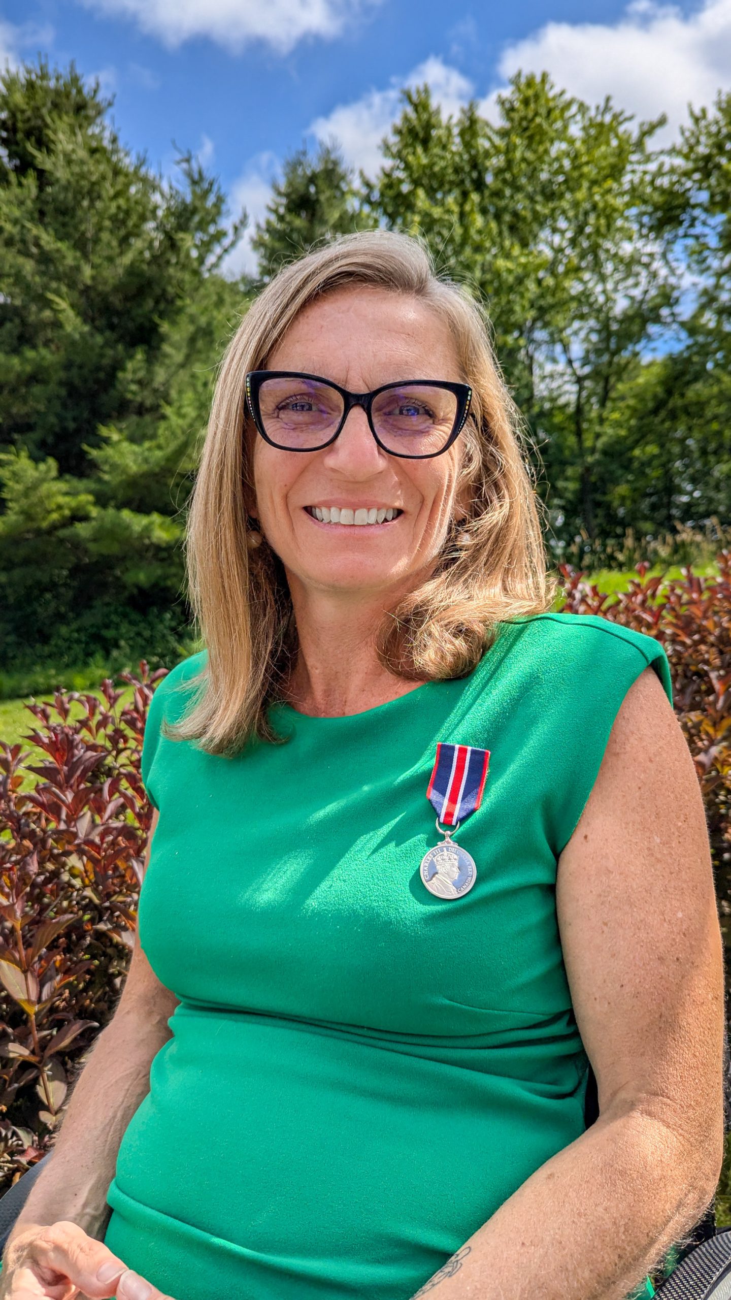 Julie Sawchuk received the King Charles III Coronation Medal on July 3 for her work as an accessibilty advocate. She’s pictured here with her medal outside her home near Blyth. (Contributed photo)