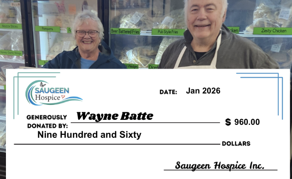 Over the 2025 holiday season, Wayne Batte once again demonstrated his generosity by hosting a Meat Draw and donating a cheque for $960 in support of the build of Saugeen Hospice.