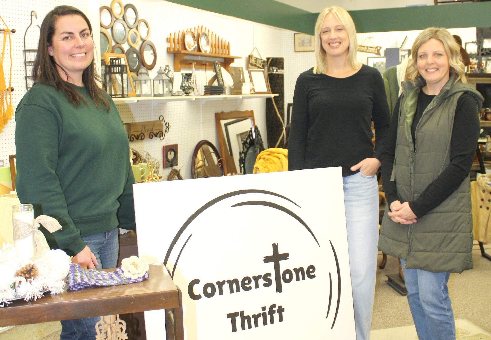 Left: Cornerstone Thrift opened in Listowel on Dec. 2. Store Managers Teresa Rastorfer, Melanie Meiner and Robin Dykstra had a very successful opening day and are looking forward to their grand opening celebration on January 10. Above: A selection of used goods, including home decor, clothing and formal attire, books, knickknacks, furniture and more are available in store which is open Tuesday to Saturday from 10 a.m. to 3 p.m. Donation drop off is welcome during business hours.(Heather MacEwen Photo)