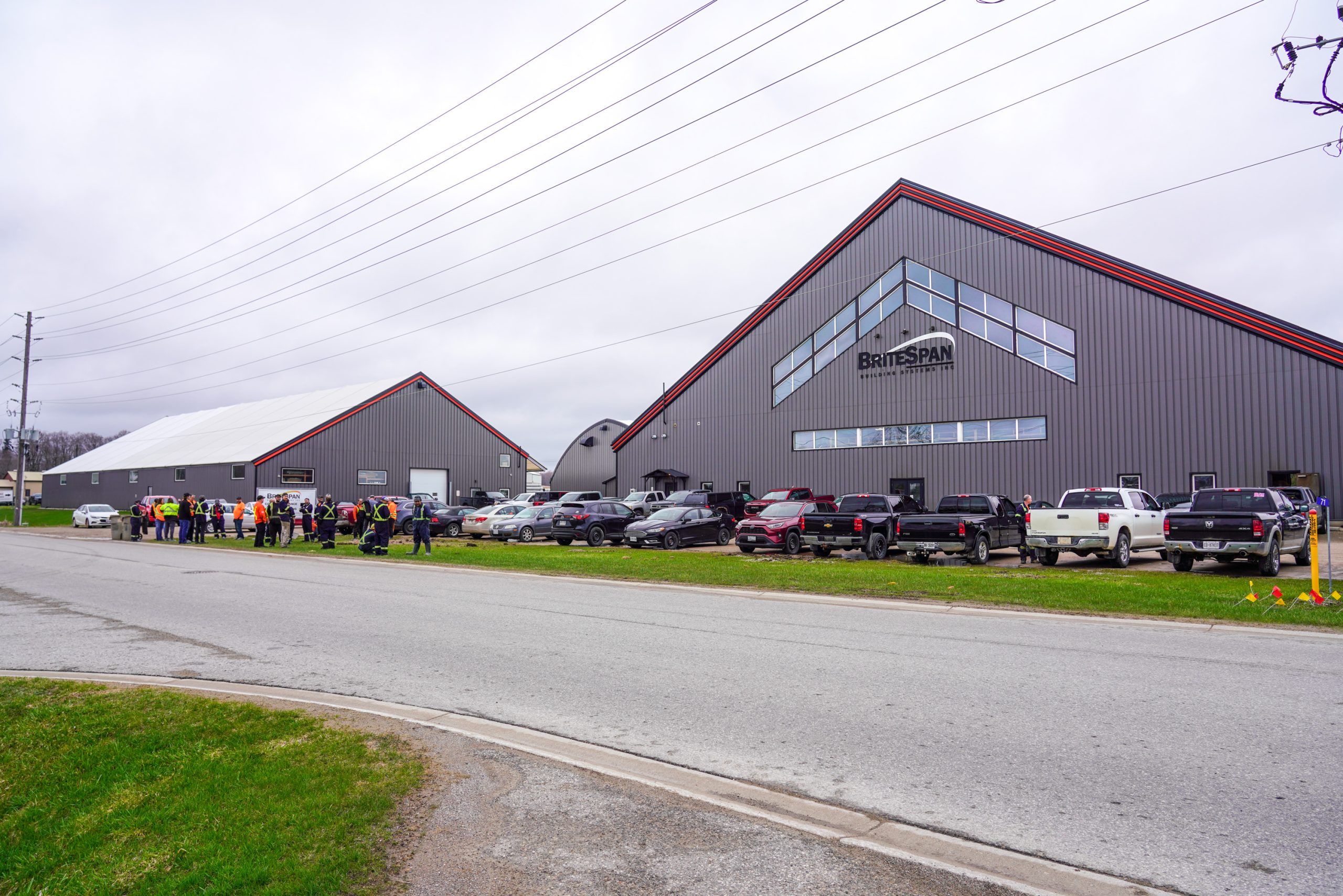 WINGHAM – The Fire Department of North Huron was called to Britespan on North Street in Wingham on Wed. Apr. 15 for a smoldering fire in a dust collector. Fire Chief Chad Kregar reported that the fire was contained to the collector. There were no injuries and damage was minor. Here, workers stand out front…