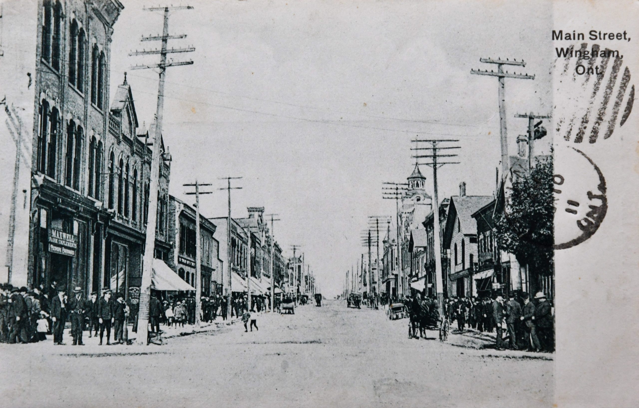 Historic Wingham came to life through a trio of early 1900s postcards shared at the recent Wingham & Area Historical Society meeting. Above, an early downtown Wingham street scene – likely captured on a parade or celebration day – reveals crowds in their Sunday best and horse‑drawn traffic. (Contributed photo)