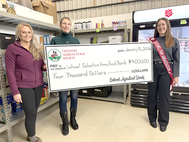 The Listowel Salvation Army Food bank was grateful to receive a generous $4,000 donation from the Listowel Agricultural Society. The funds were raised at the Listowel Agricultural Society’s Harvest Dinner and Auction this past November. Pictured above, from left, are Food Bank Co-ordinator Carolyn Saunders receiving the cheque from Agricultural Society President Carolyn van der…