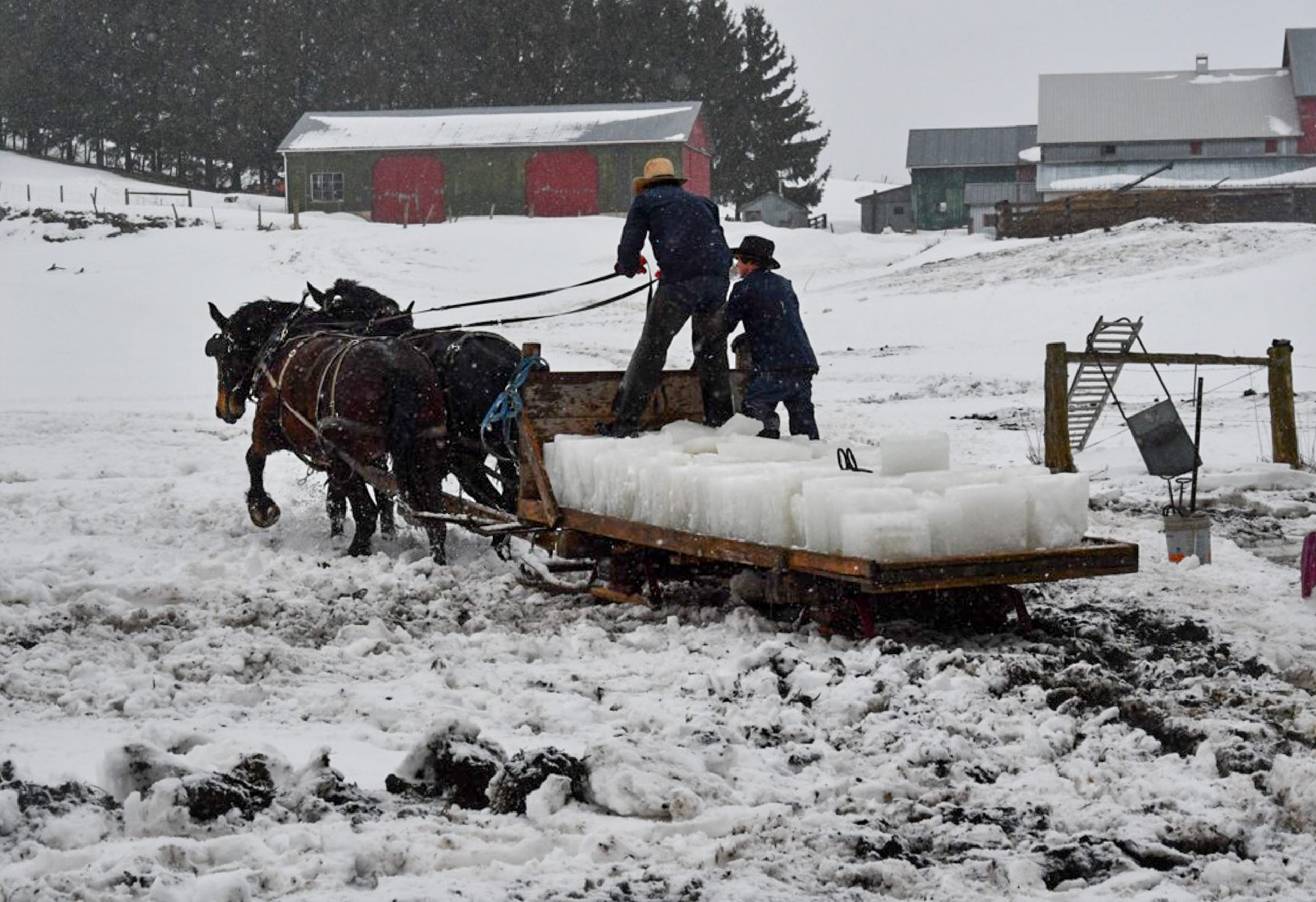 Two Amish people drive two horses, dragging a cart with cut ice through a winter field.