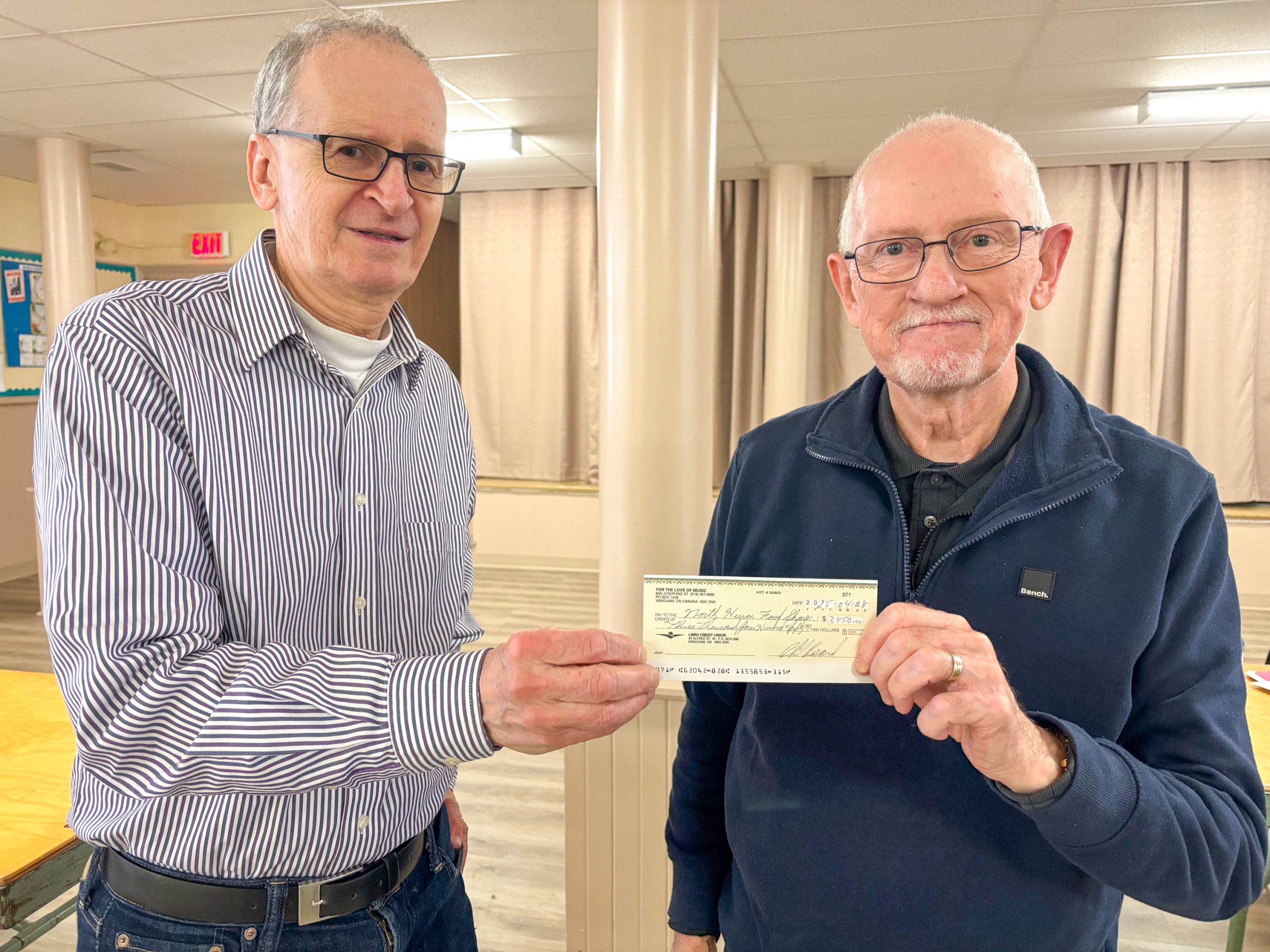 Phil Beard, left, (Thomas’s dad) presenting the cheque to Al Skelton, Food Share treasurer, after the show. (Contributed photo)