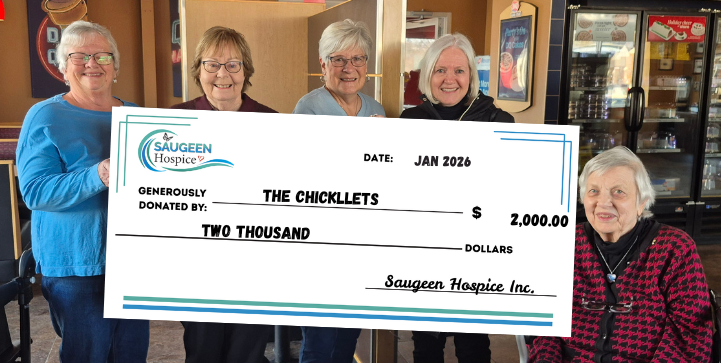 The “Chicklettes” coffee club recently presented a $2,000 donation to Saugeen Hospice. What began over 50 years ago as two friends walking and grabbing coffee has grown into a vibrant community staple. Throughout the decades, the group has moved from the Maple Leaf Restaurant to K’s Country Kitchen, and now gathers regularly at Dairy Queen. “Their long-standing bond and enthusiasm for supporting hospice care continue to make a meaningful impact in our community.,” hospice officials state.From left: Rita Grubb, Nancy Skiba, Barb Ernest, Mary Kay MacKenzie, and Maryann Buehlow. (Contributed photo)