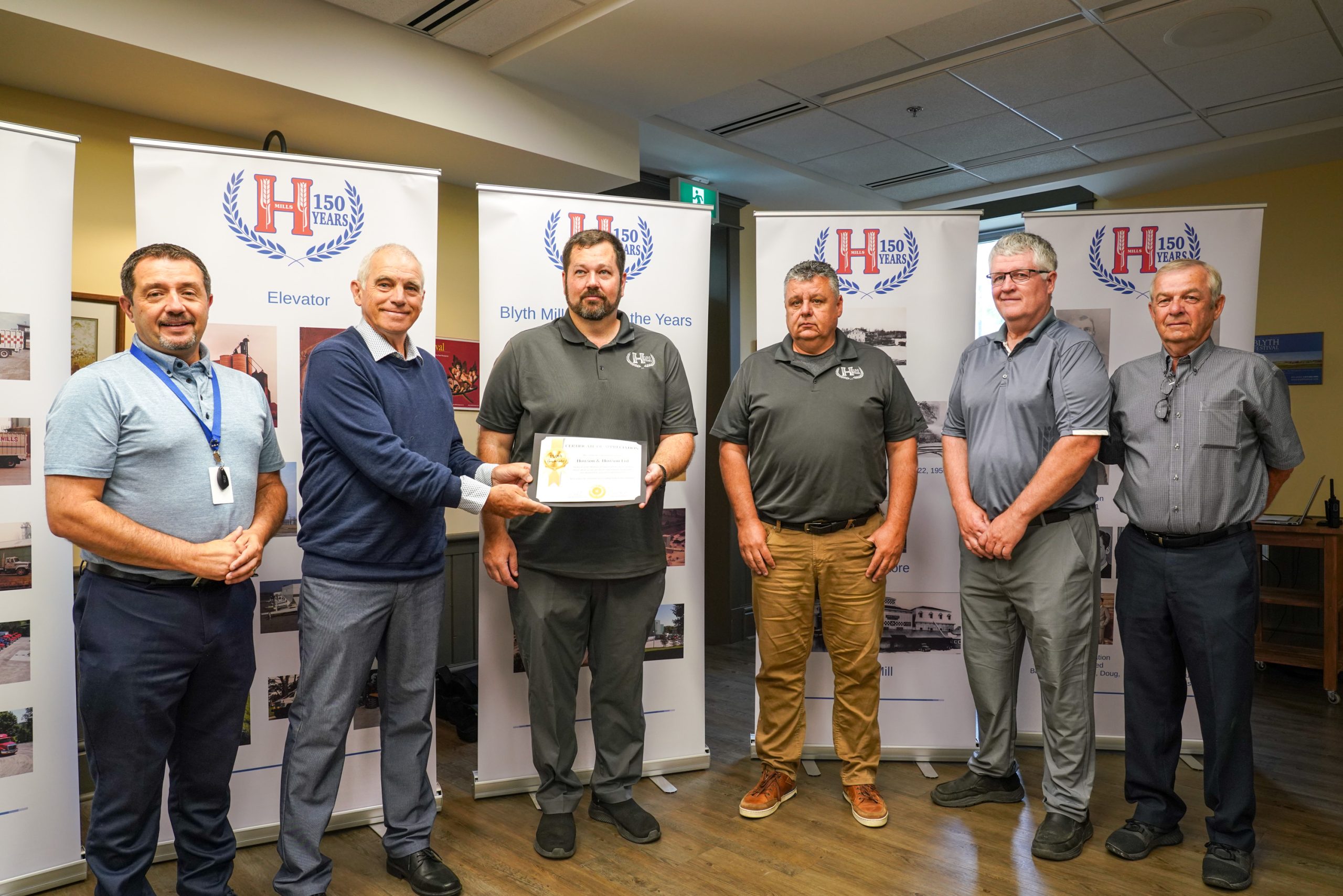 Howson & Howson officials were presented with a certificate of appreciation from North Huron at an anniversary 150th celebration on Sept. 23. From left: North Huron CAO Nelson Santos and Reeve Paul Heffer, and the current generation of company mangement Rick Howson, Jeff Howson, Steven Howson and Bruce Howson. (Cory Bilyea photo)
