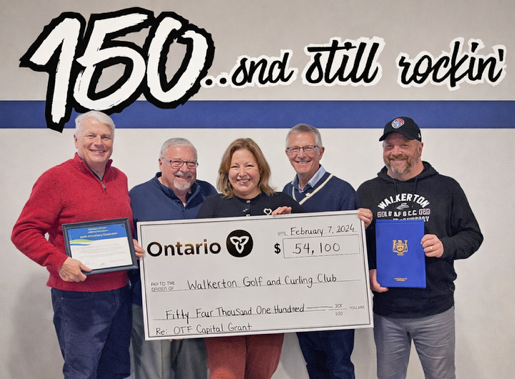 Club members and dignitaries gathered at the Walkerton Golf and Curling Club (WGCC) on Saturday, Feb. 7 to celebrate 150 years of local curling. Huron-Bruce MPP Lisa Thompson congratulated the club on the special anniversary and for receiving a $54,100 capital grant last summer from the provincial government’s Ontario Trillium Foundation (OTF). The funds will be used to install a new condenser and two heaters. Mayor Chris Peabody represented both the County of Bruce and Municipality of Brockton bringing congratulation on 150 years of curling. Recognition was given to the County of Bruce Community Grants 2025 thorough which 50 new curling brooms were purchased for the youth curling programs. From left; Mayor Chris Peabody, OTF grant review team member Bill Pearson, Thompson, Walkerton Curling Chair Randy Willick and Ellis Jr. (Contributed photo)
