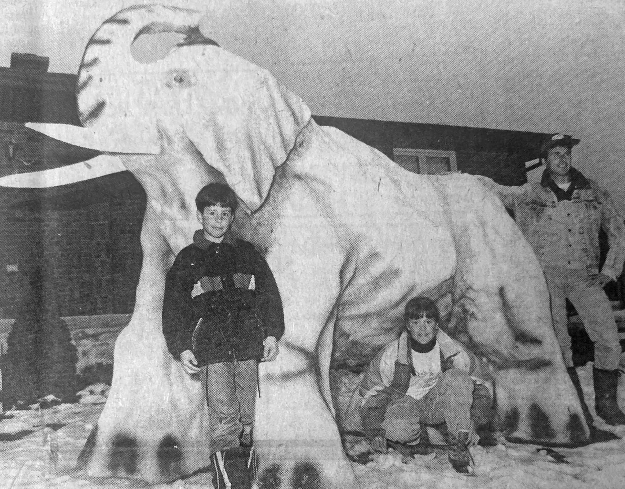 From Feb. 6, 1991: This elephant, made of snow and marked with black spray paint, took all of Monday night, Jan. 5 to make. Helping their dad, Brian, make the gigantic animal were Nigel, front, and Amber. (Herald-Times file photo)