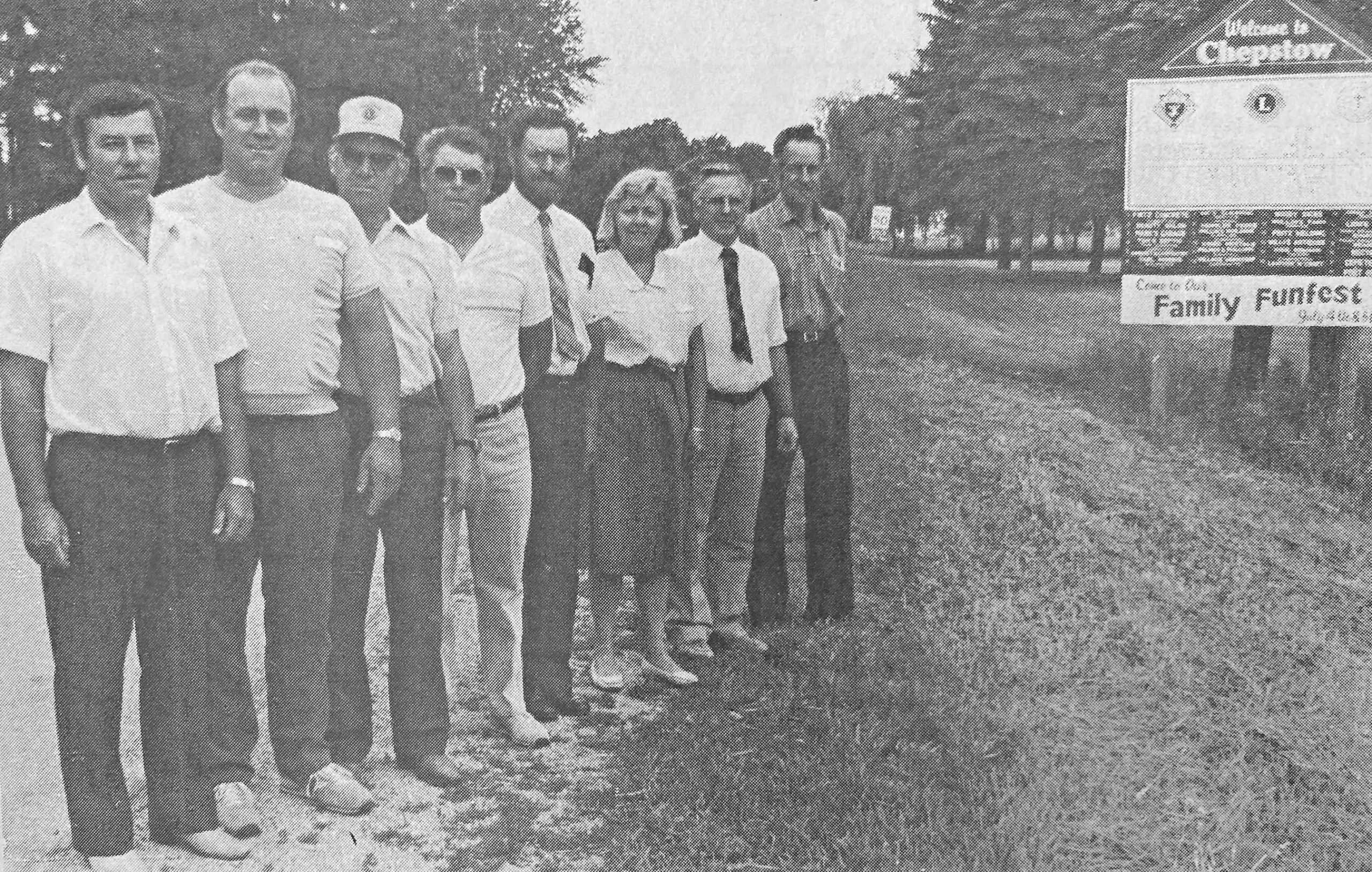 From July 1, 1987: The Chepstow and District Lions Club, along with Greenock Township coun cillors, proudly present this new sign at the entrance to the village, donated by the Lions club. There is also one at the other entrance. The signs are in the form of a map of the village. It welcomes visitors as well as directs them to the many services available.