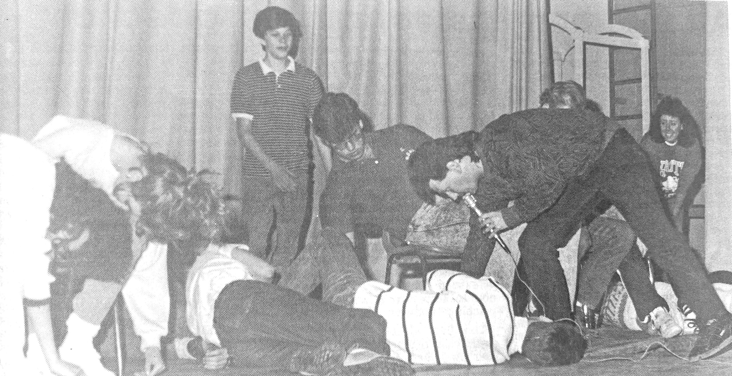 From March 30, 1988: Walkerton District Secondary School students literally fell over Casey Jones, hypnotists from Toronto, who put about 14 WDSS students under hypnosis on Monday, March 29. Here the students were just falling under his spell and thought the floor would be a more relaxing place to rest. (Herald-Times file photo)
